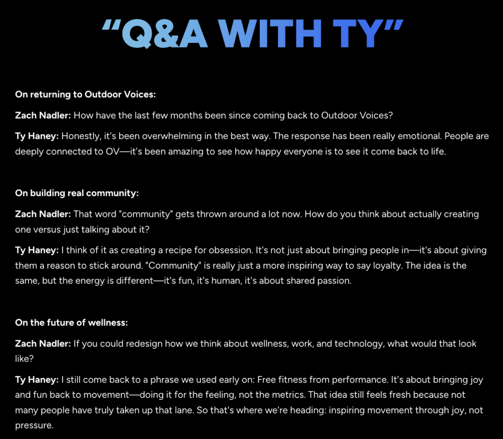 The first interview for the “Voices of the Now & Next” series featured Ty Haney, founder of Outdoor Voices. It was one of those conversations that reminded me why I love what we do.